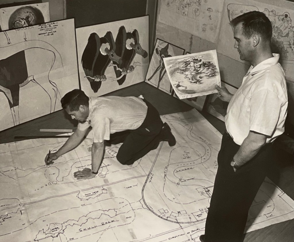 In the photo below, Disney Legend Ken Anderson and artist Ralph Hulett are working on the design for Peter Pan’s Flight, highlighting two themes that run throughout the building of Disneyland.
