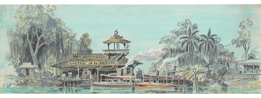 The original Jungle Cruise concept was drawn up Disney Legend Harper Goff as seen in this artwork.