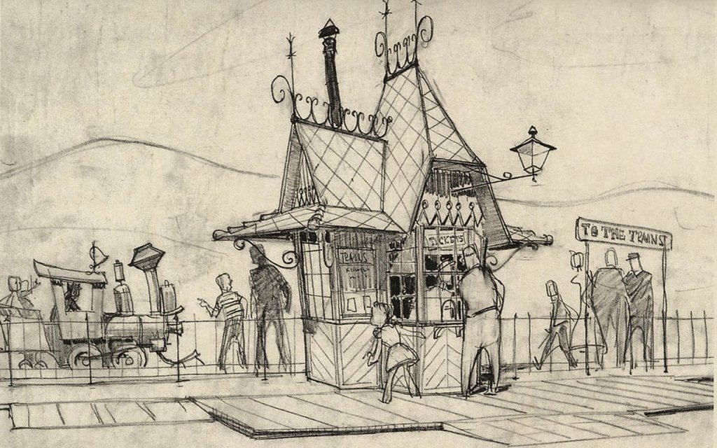 Both the trains and train station depicted in Bruce’s artwork are largely reflected in the updated version of the attraction that exists today.