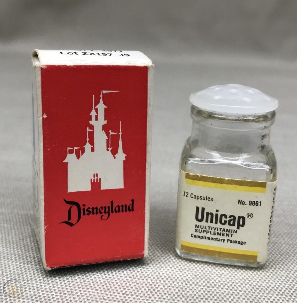 Did you know that when Disneyland first opened there was a pharmacy on Main Street? That’s right, Upjohn Pharmacy was located at the end of Main Street near the Penny Arcade. Of course, it wasn’t an operating pharmacy but rather a showcase of turn-of-the-century pharmacies and the history of medicine. Though they did hand out free mini bottles of Unicap vitamins, as you can see in the photo below.