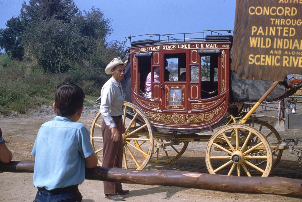All of the coaches that made up the Disneyland Stage Lines were constructed at the Studio and have the distinction of being the first Disneyland attraction completed. At the park, the coaches were one of ultimately three ways guests could explore the Painted Desert and the Indian Country of the Old West. The Pack Mules were the other opening day option while the Conestoga Wagons would be added later in the summer of 1955.
