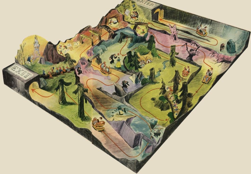 The scenes throughout the attraction matched those from Disney’s first full-length feature animated film, Snow White and the Seven Dwarfs, which was released in 1937. The track layout was designed by Imagineer Bill Martin and the work on the artwork throughout the attraction was led by Disney artist Ken Anderson. The mine car ride vehicles were built by Arrow Development.