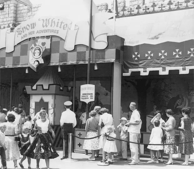 The Snow White and Her Adventures attraction was one of Disneyland’s original dark rides in Fantasyland, a new type of amusement park ride at the time. Later, the attraction was renamed Snow White’s Scary Adventures.