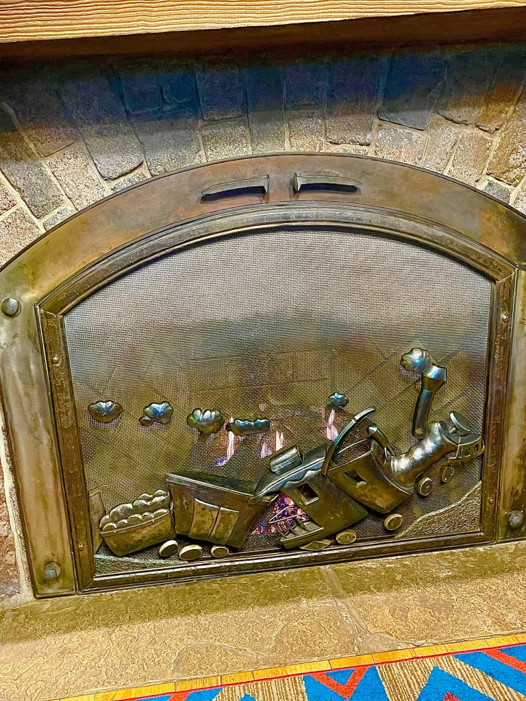 The cozy room includes chairs and a fireplace adorned with an extraordinary steel screen featuring a train that reminds me of Casey Jr.