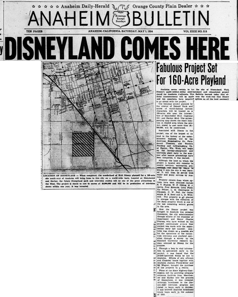 Anaheim Mayor Charles Pearson, city staff and the Chamber of Commerce were credited with working to make the project a reality since the summer of 1953. The article also notes that “a leak in vital information to speculators early in the project” almost derailed the Anaheim location.