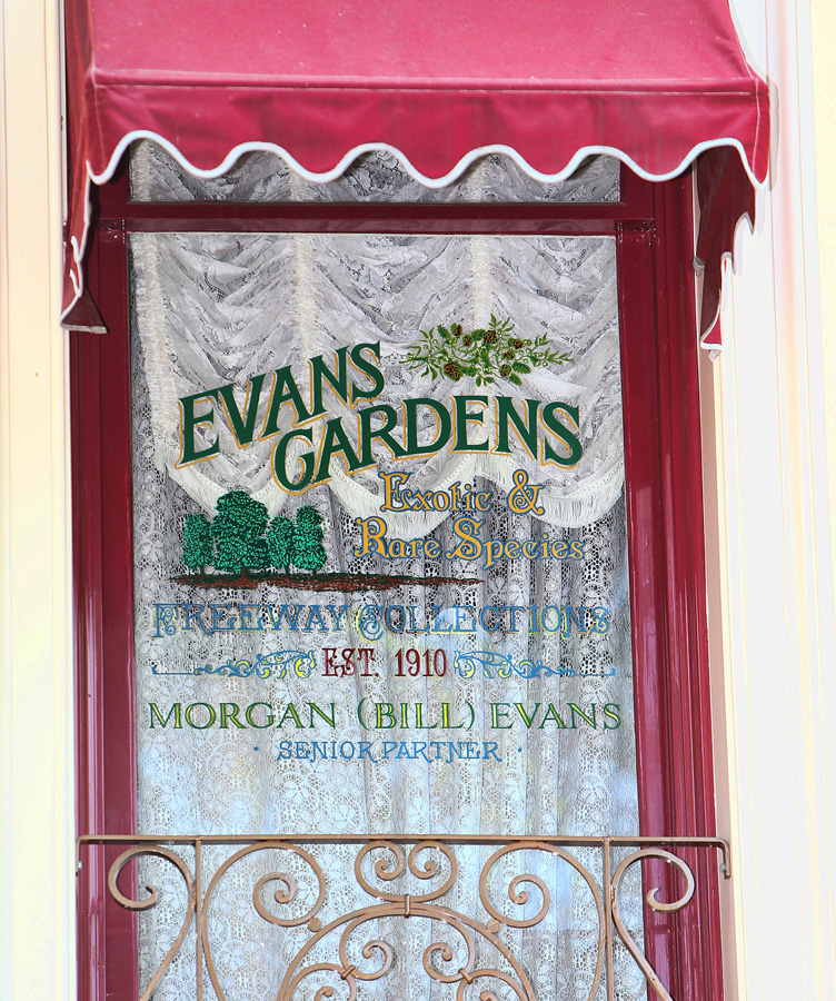 In 1990, a Main Street, U.S.A. window above the Opera House was dedicated in his honor. It reads: “Evans Gardens, Exotic & Rare Species, Freeway Collections, Est. 1910, Morgan (Bill) Evans, Senior Partner.” The Freeway Collections mention is a nice nod to the trees he “rescued” from the bulldozers and transported to the park. Bill was named a Disney Legend in 1992.