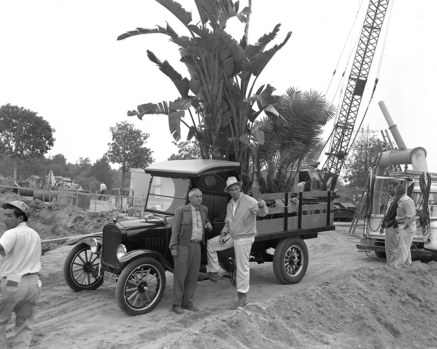Walt also presented Bill with another daunting task – build a jungle in the southern California climate. To pull off what he’d later call “the best darn jungle this side of Costa Rica,” Bill assembled a unique selection of plants – most of which would not normally be found in a tropical environment. They included palms, tree ferns, philodendrons and a bamboo variety from China. Working together with Disney Legend and Imagineer Harper Goff, the pair got creative with their limited options They famously took the uprooted walnut trees from the pre-existing farmed land, inverted and trimmed them down to look like tropical mangroves. In the Disney Family Album television show, Bill explained: “What we’ve attempted to do in planting this jungle, is to make it look as though we’ve had nothing to do with it.”