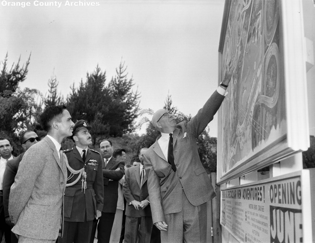 Joe Fowler and King Hussein of Jordan looking at a map of the additions coming to Disneyland in April of 1959.
