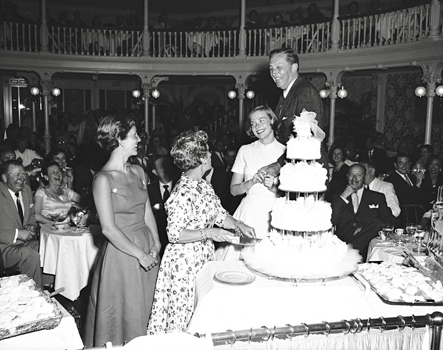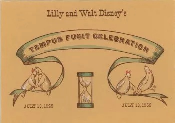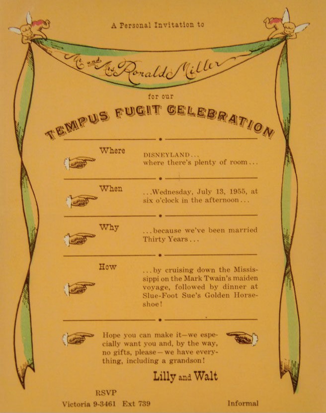 On this day in 1955, Walt Disney and his wife, Lillian, celebrated their 30th wedding anniversary by hosting a party at Disneyland just days before its grand opening. Approximately 250 people, including Hollywood friends, colleagues and family members, were invited to what the couple dubbed their “Tempus Fugit Celebration” (tempus fugit is a Latin phrase that roughly translates as “time flies”). The party invitation noted the location would be at Disneyland “where there’s plenty of room” and that the festivities would include “cruising down the Mississippi on the Mark Twain’s maiden voyage, followed by dinner at Slue-Foot Sue’s Golden Horseshoe!” Guests were also told “no gifts, please—we have everything, including a grandson!”