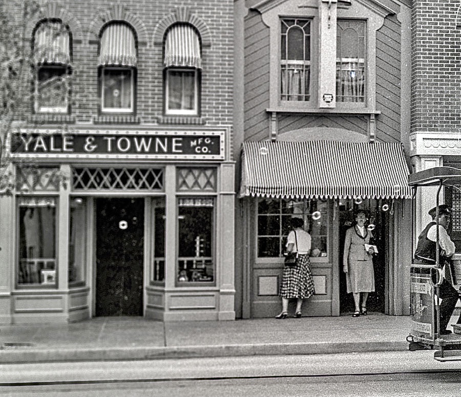 The Yale and Towne Lock Shop was one of the original stores on Main Street, U.S.A. Located along the southeast block of Main Street near the Cinema, the shop was leased by the Connecticut-based Yale and Towne Co., one of the oldest lock companies in the world. At the shop, you could look at a display of historic locks and keys as well as get a souvenir Disneyland key.