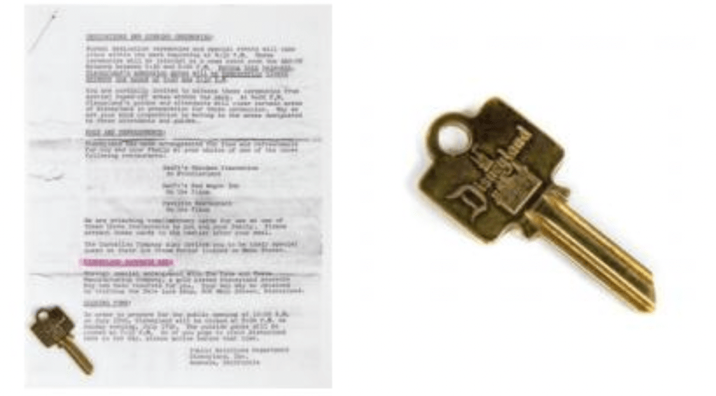 On Disneyland’s opening day, guests were given a letter which explained they could pick up a free souvenir at the Yale and Towne Lock Shop. The souvenir was a keepsake key with Sleeping Beauty Castle on one side, and the word Disneyland on the other.
