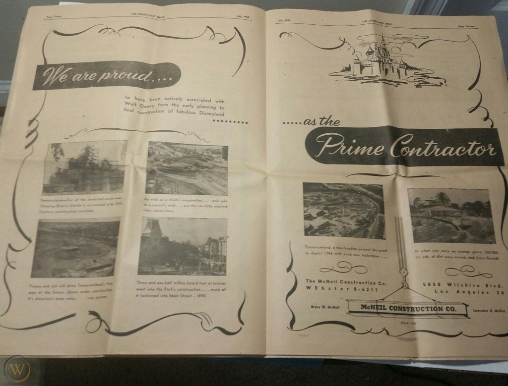 When Disneyland opened in July of 1955, McNeil Construction took out a number of ads promoting its involvement with the project. One of the ads features a note from Lawrence and Bruce that reads “Thanks, Walt Disney, for creating Disneyland, the new wonder of the world. And thanks for having selected us as the prime contractor for its construction.”