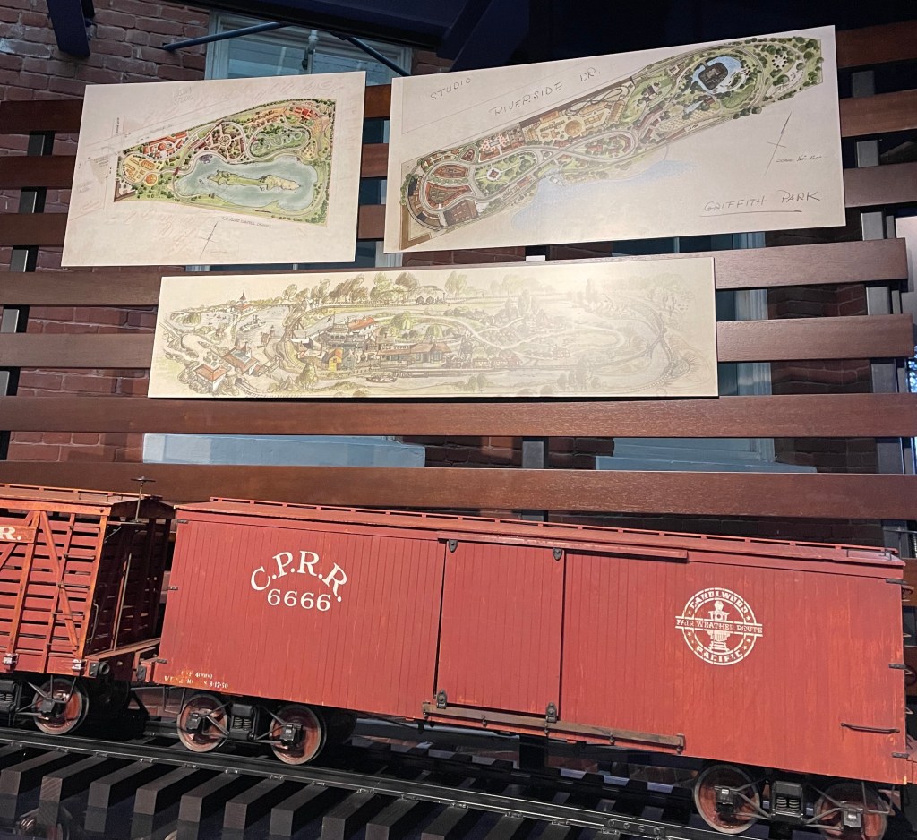 Early concept drawings by Imagineer Harper Goff for a “Mickey Mouse Park” located at the Disney Studios in Burbank hang above the train.