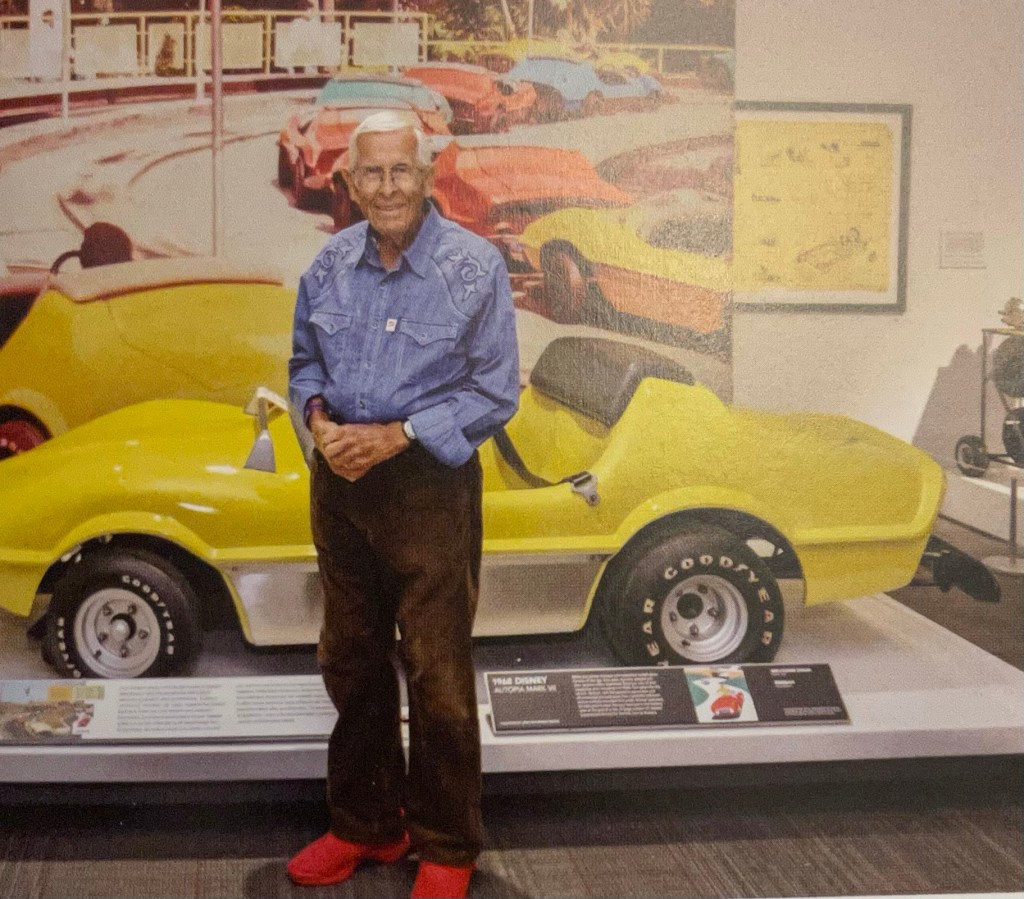 “A few weeks after starting with Disney, a group of us were huddled around an Autopia chassis and this old guy walks up, unshaven, funny short tie and Roy Rogers-style western belt. I thought this was the father of one of the night guards. We talked at great length about the car. When this guy walked away, everyone said, “See ya, Walt.” I thought, “Was that Walt Disney?” So I was never formally introduced. He was just another person in the midst of the conversation. And it was not until my third week, when Walt asked me questions about my books on car design, that we officially met.”