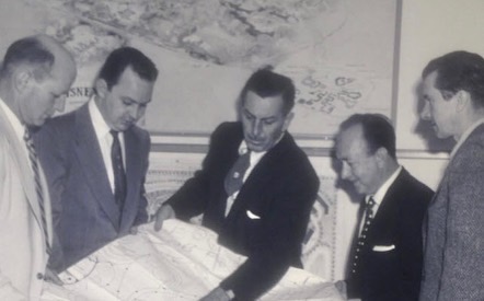 Original Disneyland planners Dick Irvine, Nat Winecoff, and Bill Cottrell joined Buzz on the trip. In a scene out of Mad Men, they stocked up a Sherman hotel suite with caviar and Chivas Regal and invited some of the nation’s leading amusement park owners. The group included William Schmitt from River View Park in Chicago, Harry Batt from Pontchartrain Park in New Orleans, Ed Schott from Coney Island in Cincinnati, and George Whitney from Playland in San Francisco.